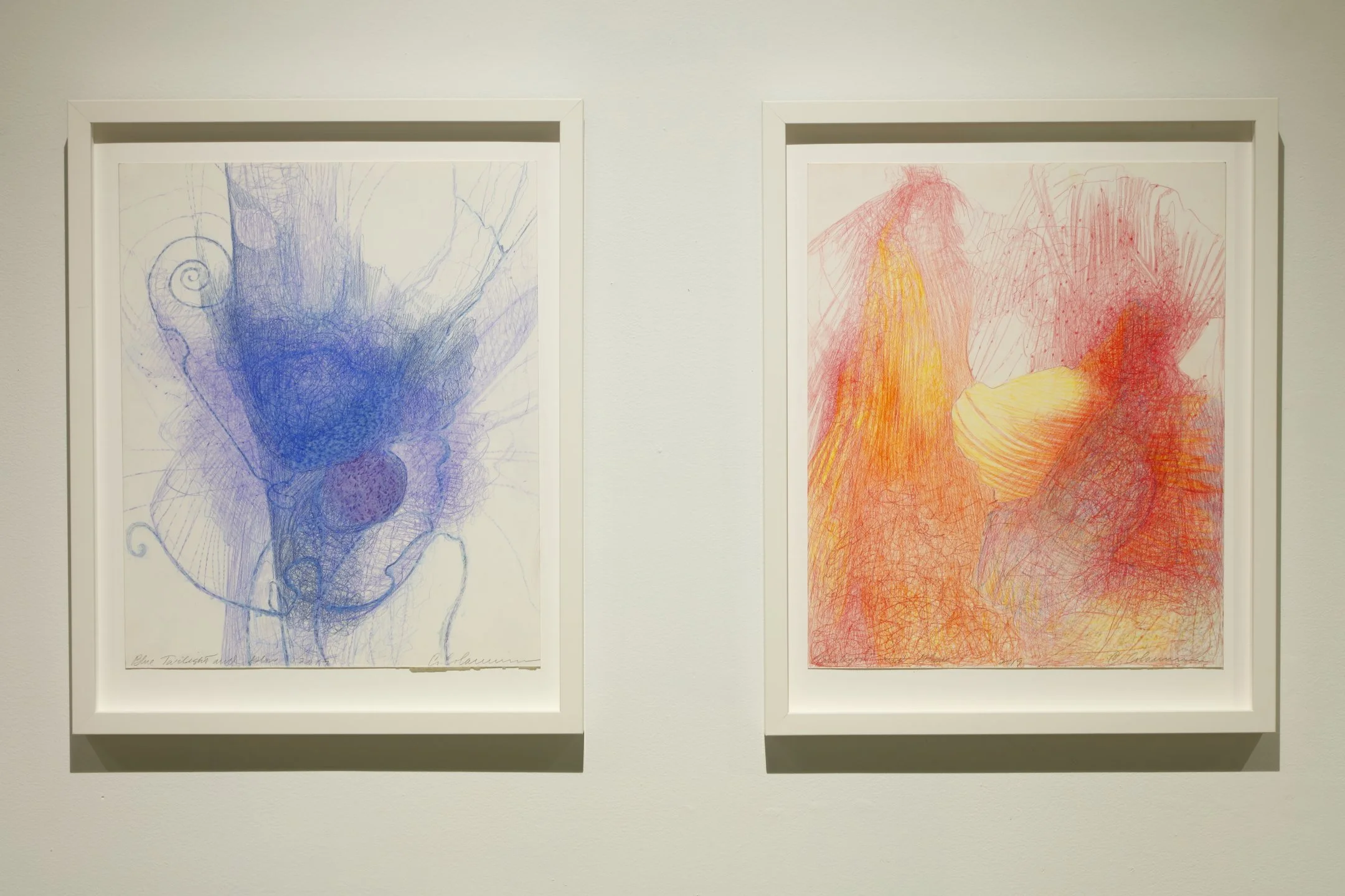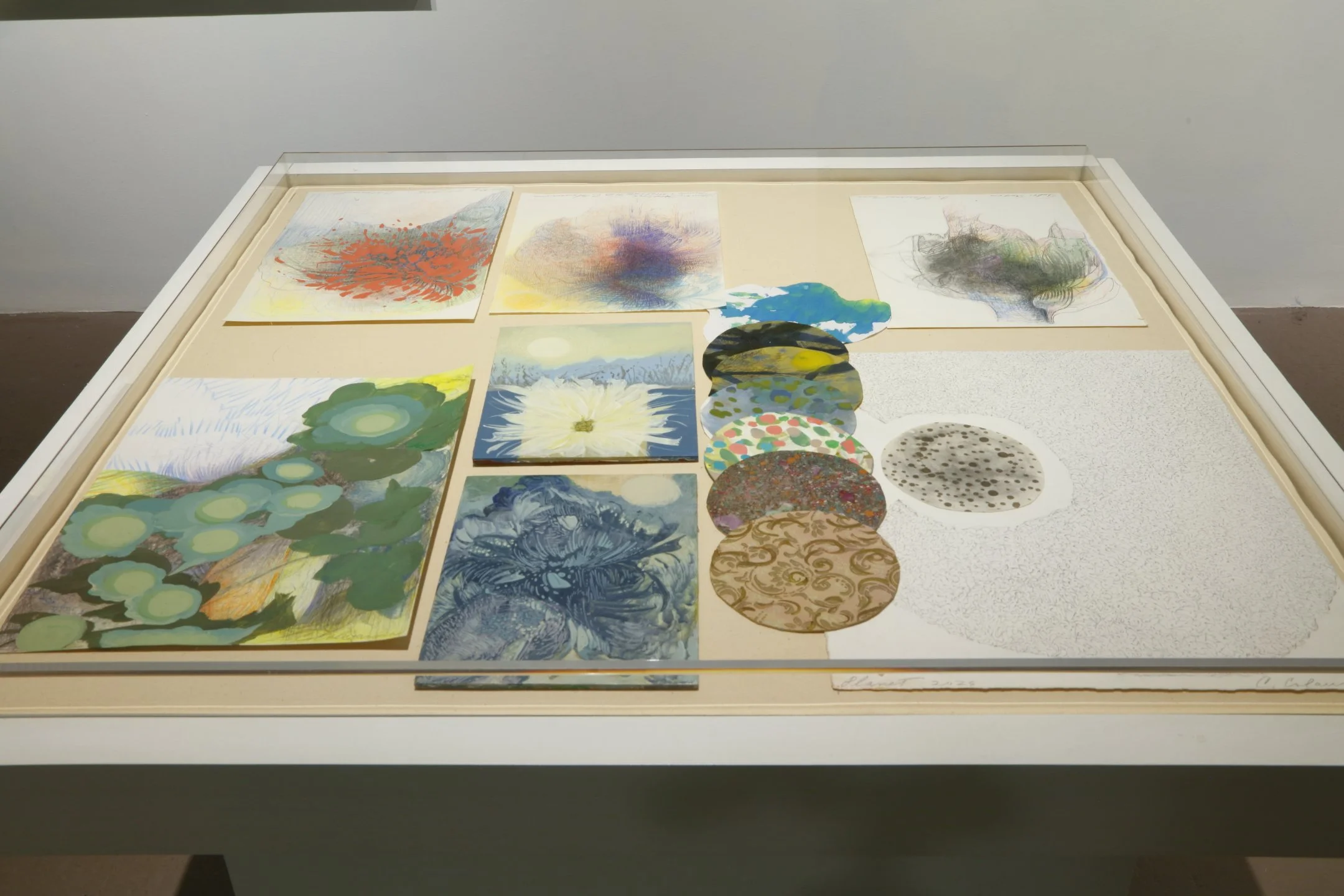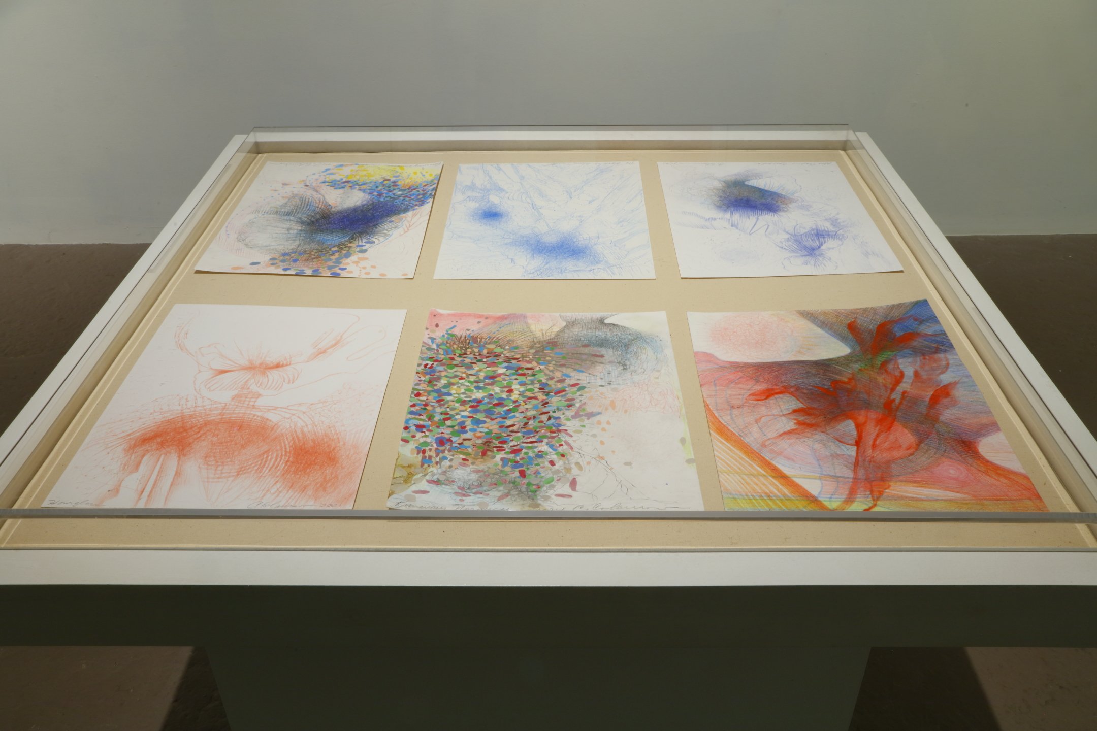 Runaway Universe, display case 6 drawings each 14 x 11 inches, pencil on paper and paint and pencil on paper